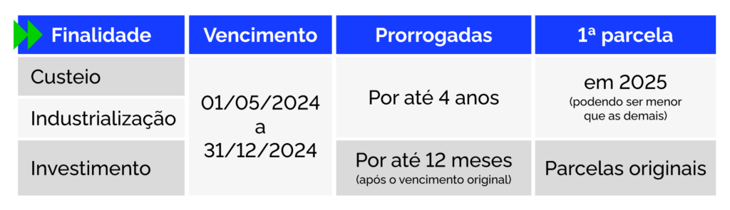 No caso das operações de custeio e industrialização, a prorrogação pode ser estendida por até quatro anos, com a primeira parcela vencendo em 2025. Para operações de investimento, as parcelas podem ser prorrogadas por até 12 meses após a data de vencimento do contrato. Em ambos os casos, as demais condições do contrato original serão mantidas. Os mutuários deverão solicitar a prorrogação até 13 de setembro de 2024.